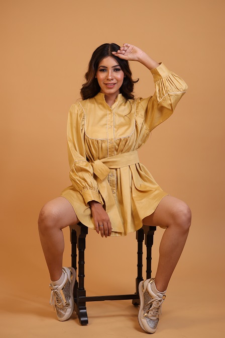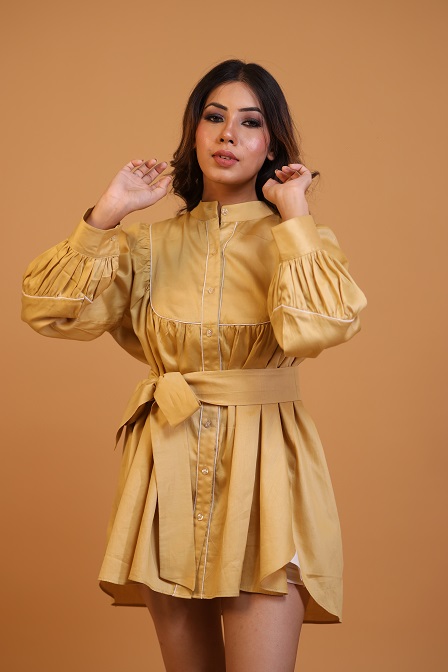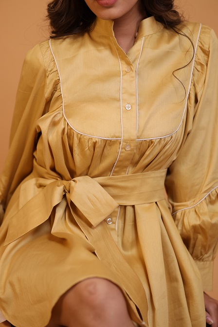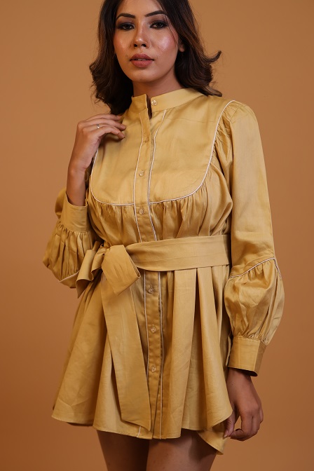 Details.. bib cut, gathered mini dress, with tie up belt